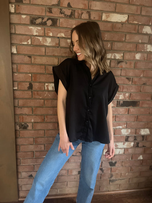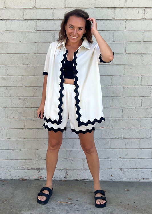 White Button Down with Black Wave Trim